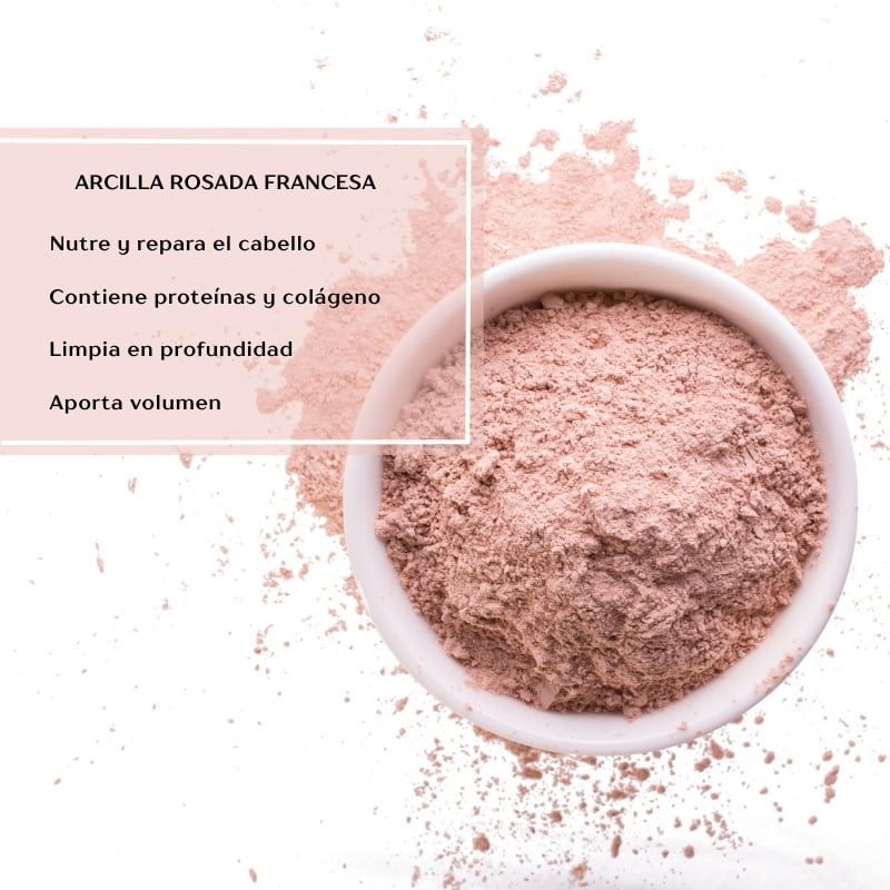 - Arcilla Rosada Francesa, desintoxica las raíces aportándoles volumen, nutre y repara el cabello gracias al colágeno y proteínas, lo limpia en profundidad respetando la oleosidad que necesita la hebra.